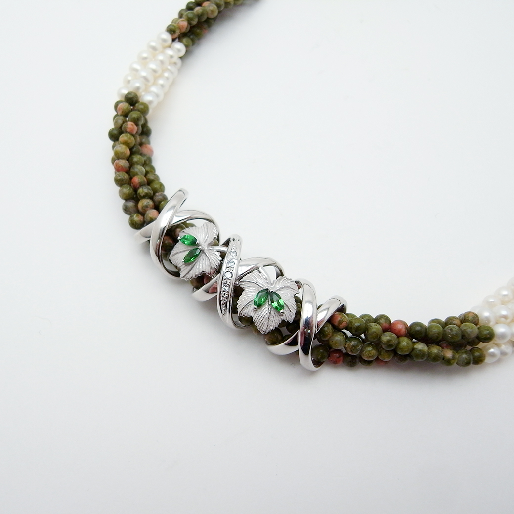 鞍田みどり ツァボライト ダイヤモンド ユナカイト 淡水パール ネックレス 41cm D0.06ct K18WG/SV 証明書 付き SAランク 518018